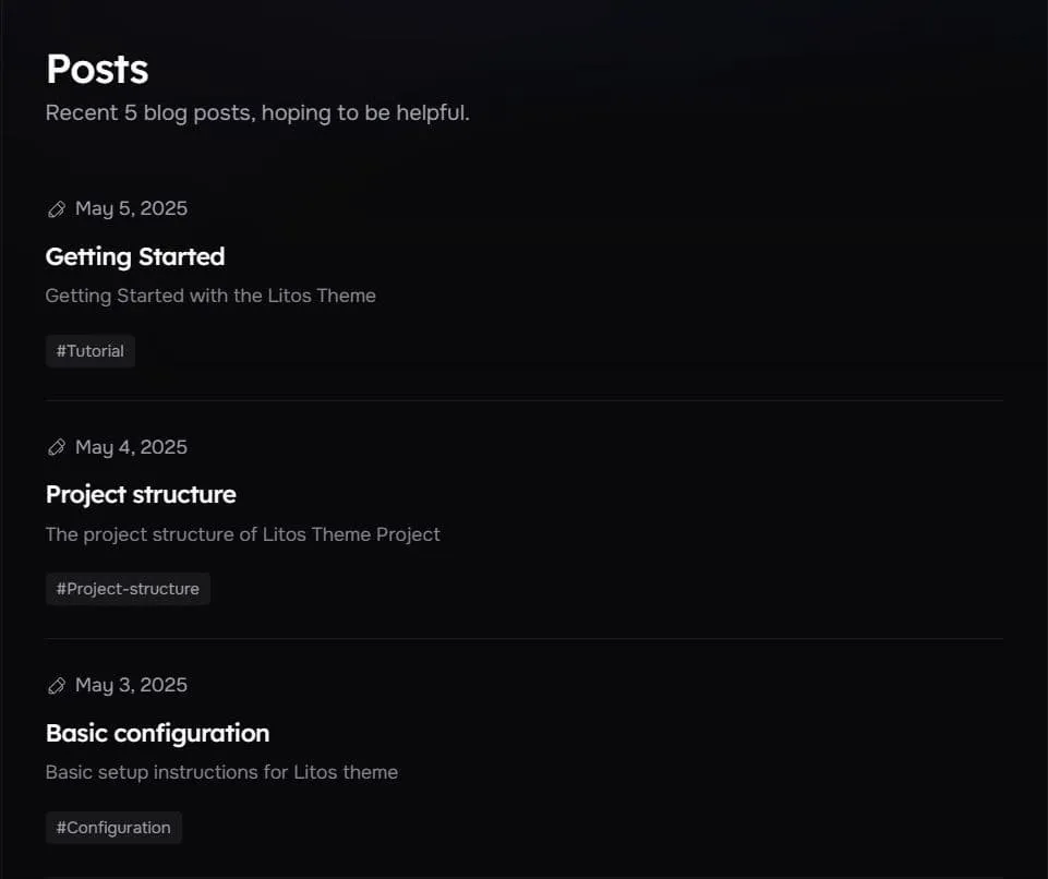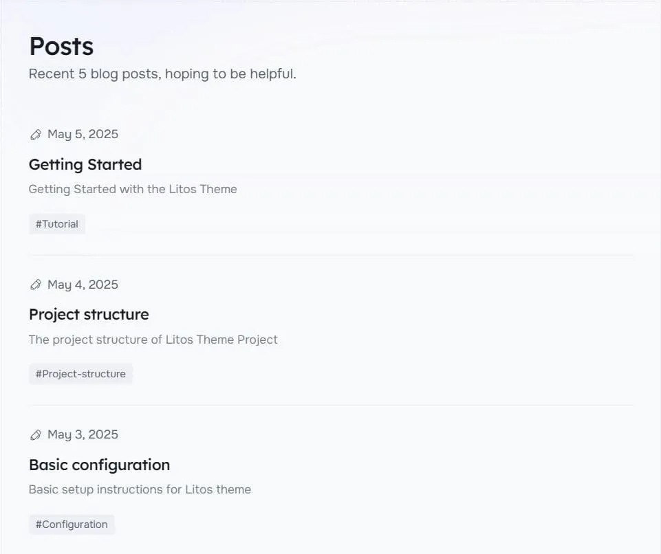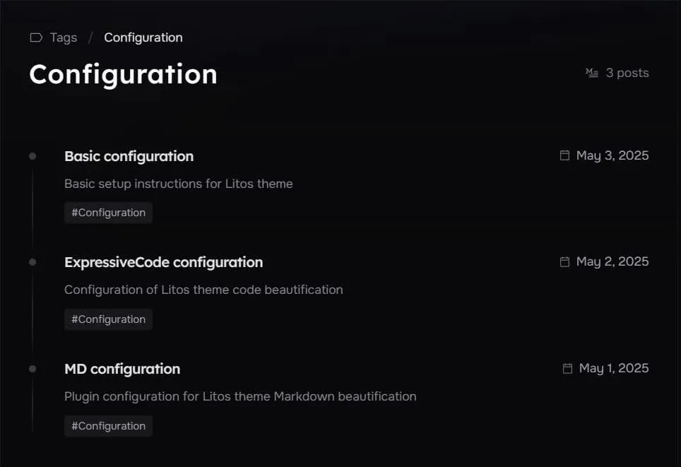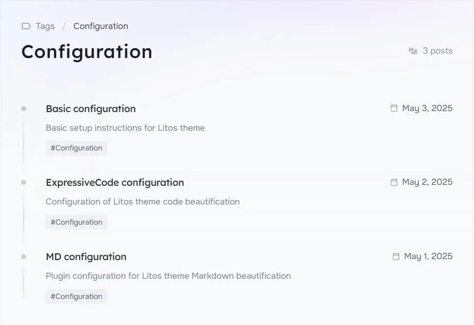 Litos通过src/config.ts中的POSTS_CONFIG对象提供了博客文章的全面配置选项。本节涵盖文章显示设置、分页和布局选项。
