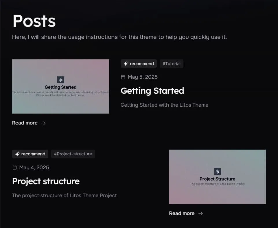 在三个页面上配置您认为合适的样式,当然,您也可以通过在src/components/posts/card中创建自己的卡片文件,并将其导入同一目录下的List.astro来创建自己的卡片样式。