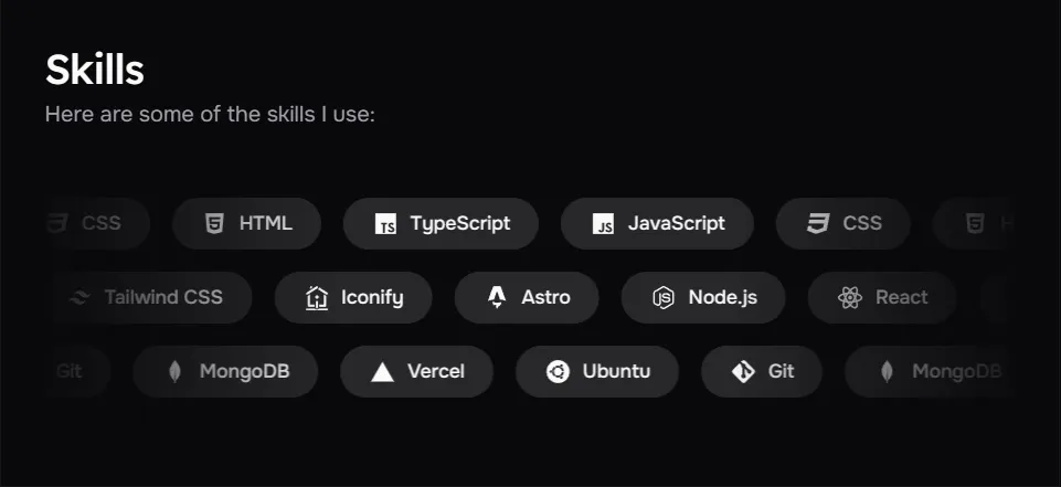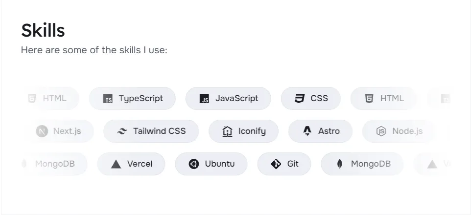 export const SKILLSSHOWCASE_CONFIG: SkillsShowcaseConfig = { SKILLS_ENABLED: true, SKILLS_DATA: [ { direction: 'left', skills: [ { name: 'JavaScript', icon: 'icon-[mdi--language-javascript]', }, { name: 'CSS', icon: 'icon-[mdi--language-css3]', }, { name: 'HTML', icon: 'icon-[mdi--language-html5]', }, { name: 'TypeScript', icon: 'icon-[mdi--language-typescript]', }, ], }, { direction: 'right', skills: [ { name: 'Astro', icon: 'icon-[lineicons--astro]', }, { name: 'Node.js', icon: 'icon-[mdi--nodejs]', }, { name: 'React', icon: 'icon-[mdi--react]', }, { name: 'Next.js', icon: 'icon-[devicon--nextjs]', }, { name: 'Tailwind CSS', icon: 'icon-[mdi--tailwind]', }, { name: 'Iconify', icon: 'icon-[line-md--iconify2-static]', }, ], }, ],}以下是SKILLSSHOWCASE_CONFIG配置对象中各种属性的详细说明: